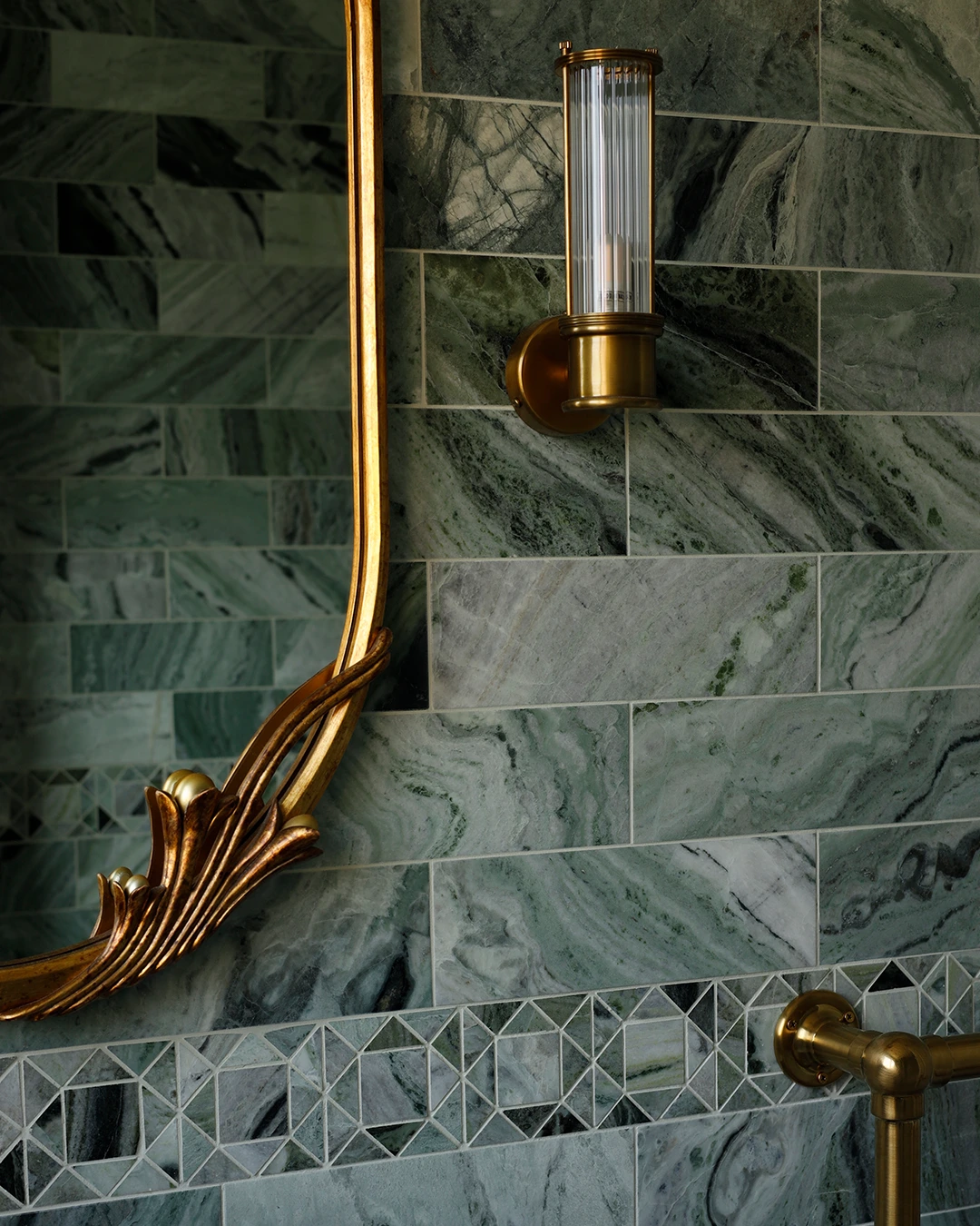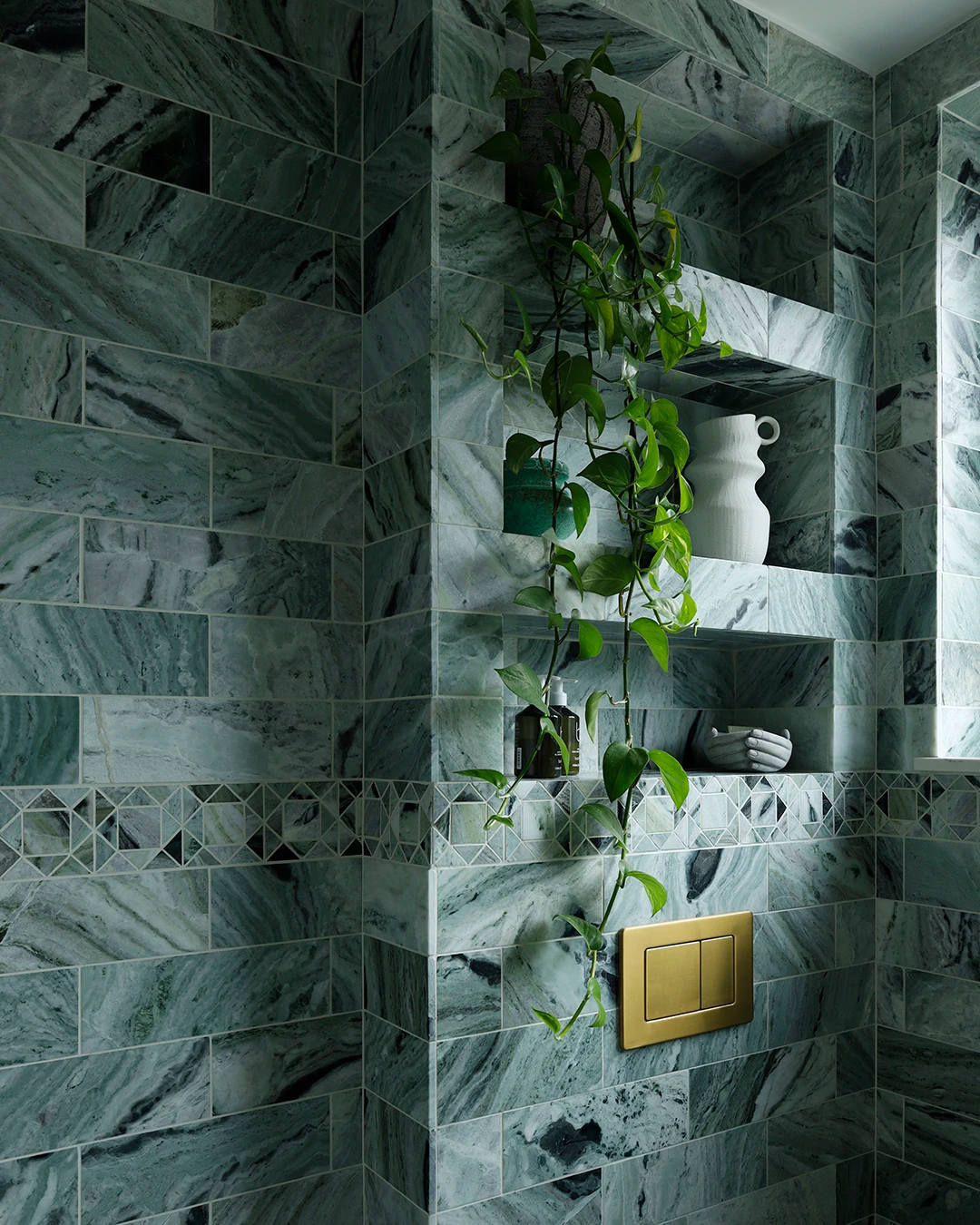 This refined and sophisticated bathroom was inspired by ancient Roman baths, blending green marble with living brass to create a calming yet elegant energy. We repurposed a very small space to improve functionality and deliver a bathroom that is both well-designed and inviting.