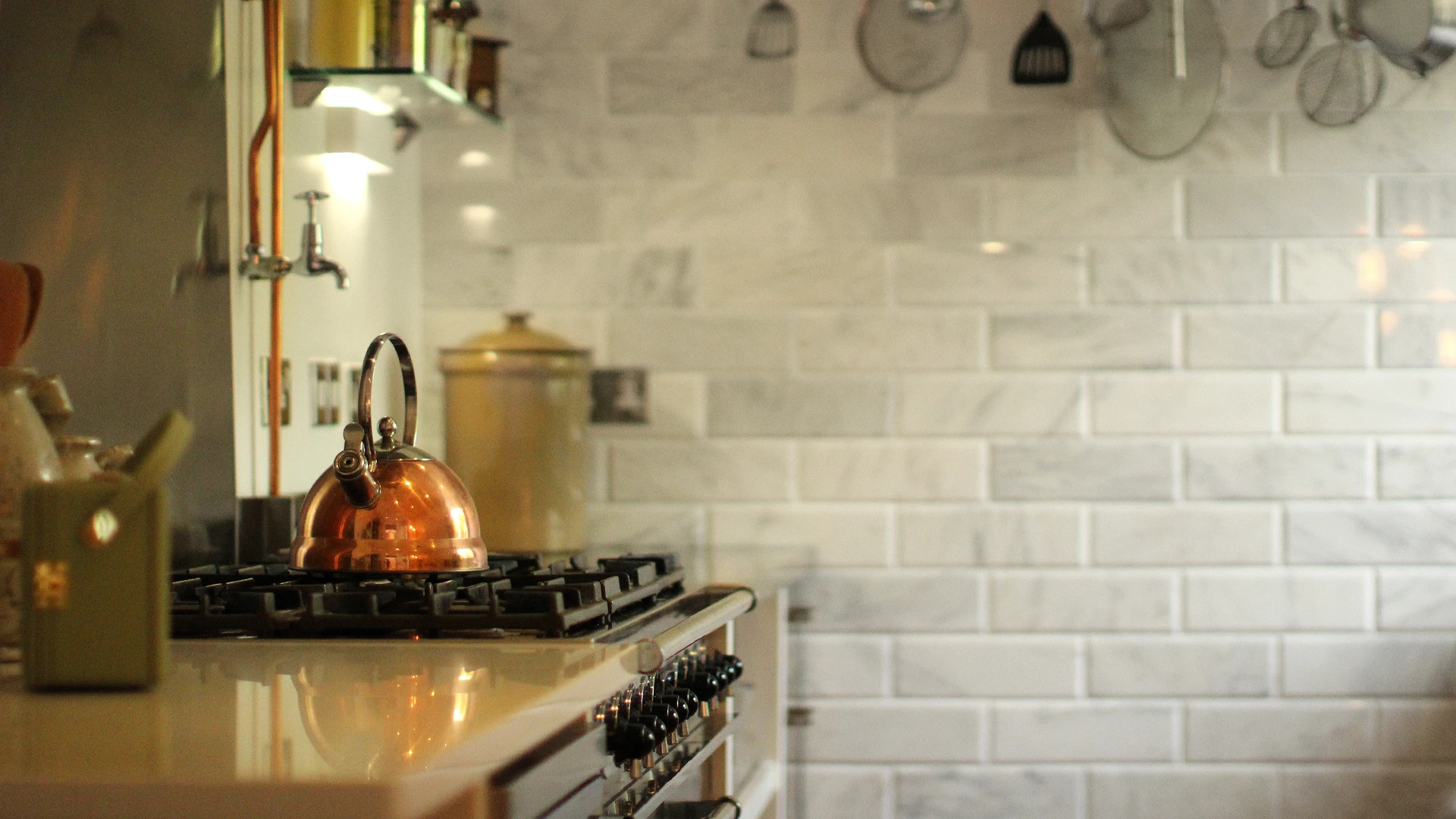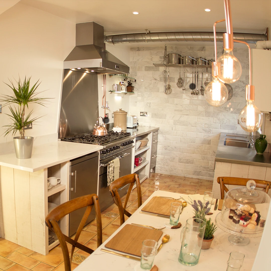 A master bedroom and kitchen project in Bengeo. A bold wallcovering paired with muted panelling creates a master bedroom that balances maximalist style with a calming, serene atmosphere. A family of passionate cooks sought a kitchen that was both highly functional and full of character — a space with personality yet built to last. Stainless steel provides durability for a busy kitchen, while subtle vintage touches, including hints of copper and marble, add warmth and timeless style.